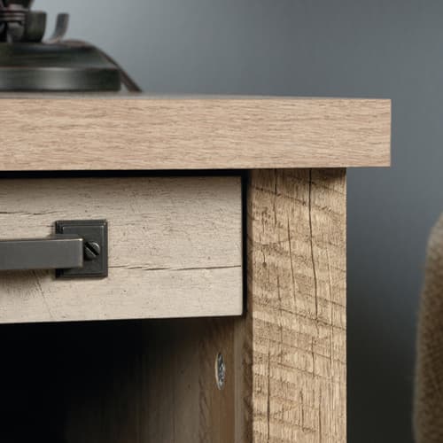 Enjoy a classic look with vintage appeal with this side table from the Sauder Cannery Bridge collection. Pull-out shelf with metal runners and safety stops. Open shelf provides additional storage. Drawer with metal runners and safety stops features patented T-lock assembly system. Finished on all sides for versatile placement. Lintel Oak finish.