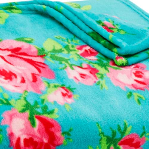 This Betsey Johnson Bouquet Day Ultra Soft Plush throw blanket will brighten up your home. The large floral design on the plush teal ground will make you feel like its spring all year round. 100% Polyester. Machine wash cold. Tumble dry low. Measures: 50” x 70”.