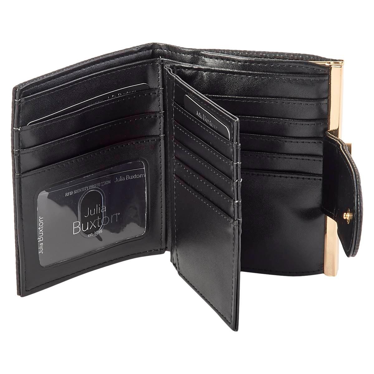 Store you cards and cash in style with the Womens Buxton Lexington wallet. This wallet features a kisslock closure compartment, double snap button closure, 15 credit card slots, 8 storage pockets, bill compartment, and an I.D. window.