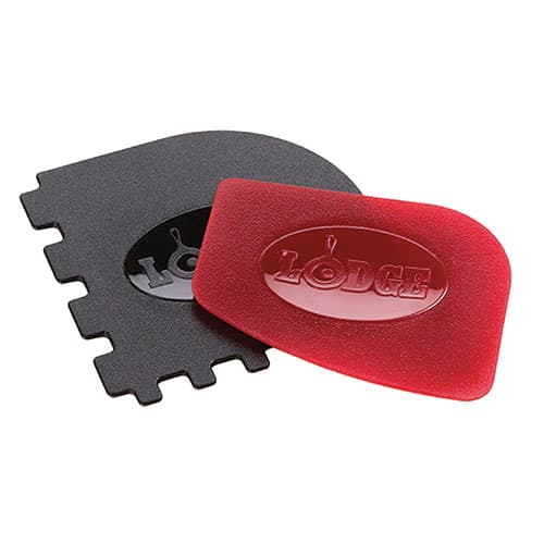 Lodge 2-pack of pan scrapers is the perfect way to clean your cast iron with ease and care. It includes one red scraper for pans and one black scraper with two specially designed sets of "teeth" that will fit any modern Lodge grill pan. Each feature a durable polycarbonate construction and is dishwasher safe. Sizes: 2.5" x 3" and 3.25" x 3.25".