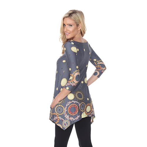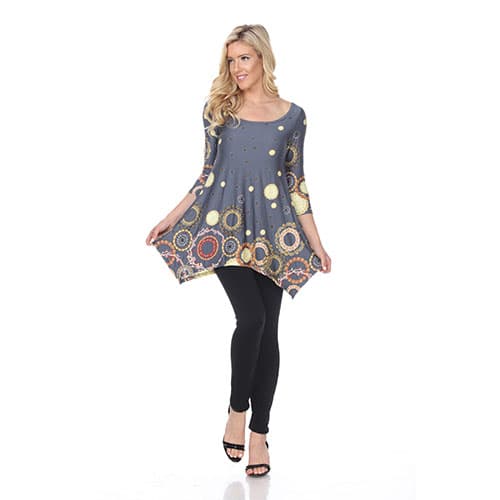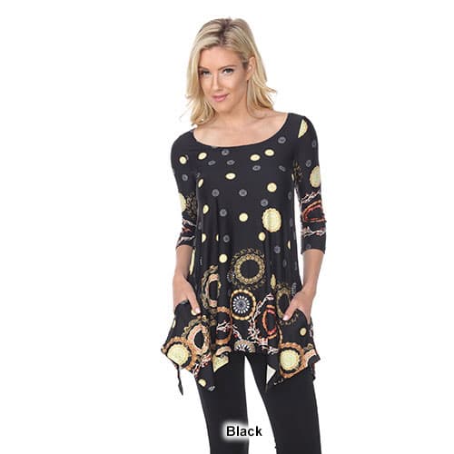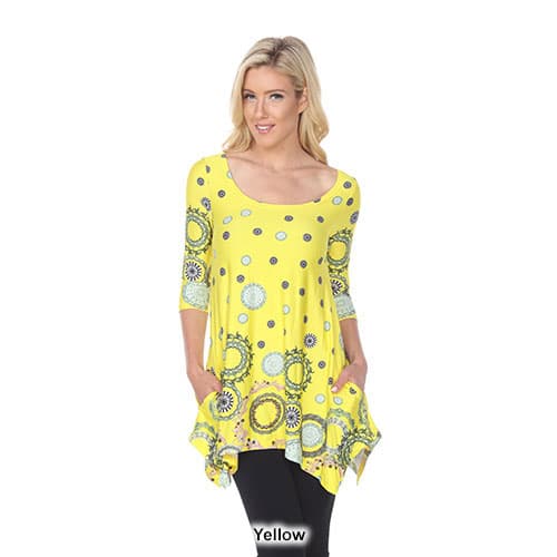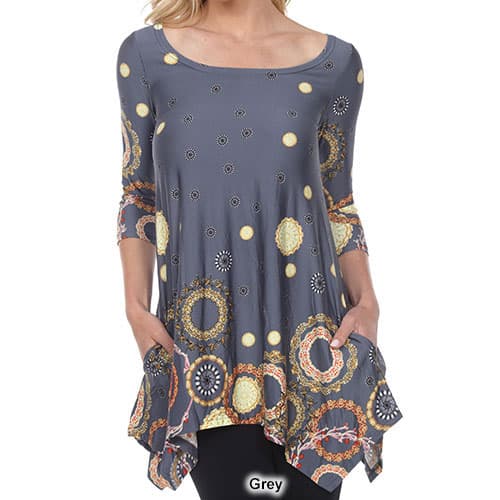 This Womens White Mark Erie tunic is flattering while draping stunningly over your body. It features a bold and flirty print with 3/4 length bell sleeves and a dashing scoop neckline.