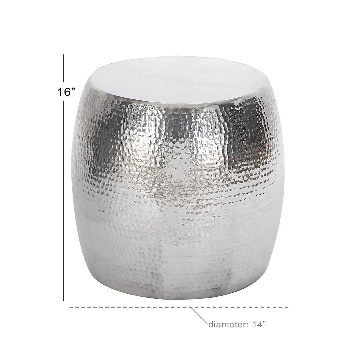 This 9th & Pike® bold, contemporary accent table features a stylish drum shape with dimensional hammered metal indentations throughout the round body and top. The versatile metallic silver finish and lightweight aluminum construction make this stylish metal side table work in practically any space while being easy to move around.
