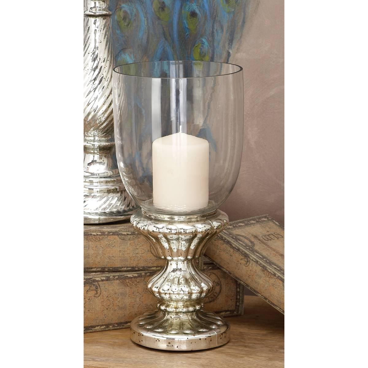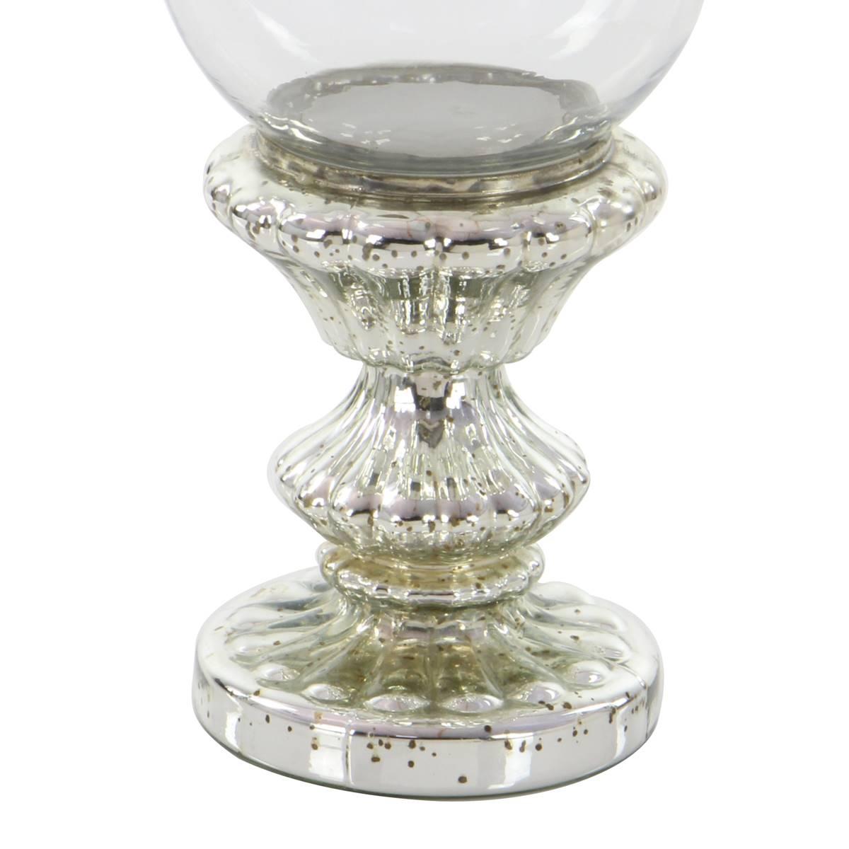 Exuding classic traditional sophistication with contemporary elegance, this 9th & Pike® silver glass candle holder features an extra large hurricane glass with a wide opening. The transparent glass top secures your large pillar candle, protecting the flame and wax from coming in contact with your surfaces. The reflective speckled silver mercury glass candle holder has a scalloped texture over the turned column silhouette for a traditional touch.