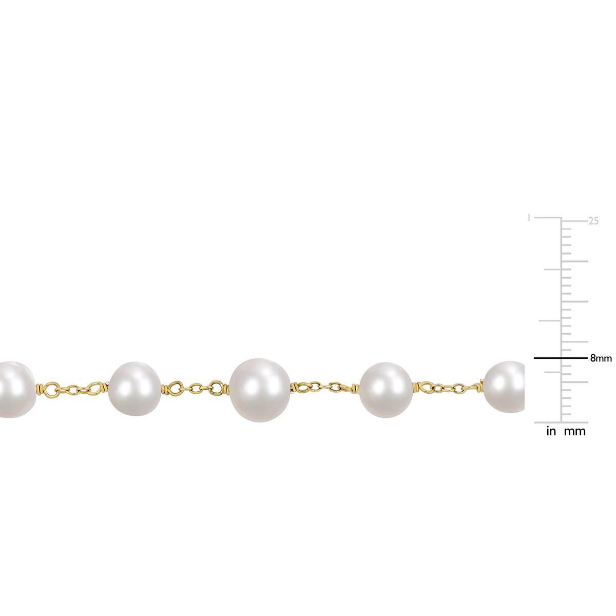 Add this Gemstone Classics™ 18kt. gold pearl bead necklace to your wardrobe to make a sophisticated style statement. The necklace features fifteen off-round freshwater cultured pearls for a stylish look. This glorious necklace is suspended on an 18-inch cable chain and secures with a spring-ring clasp.