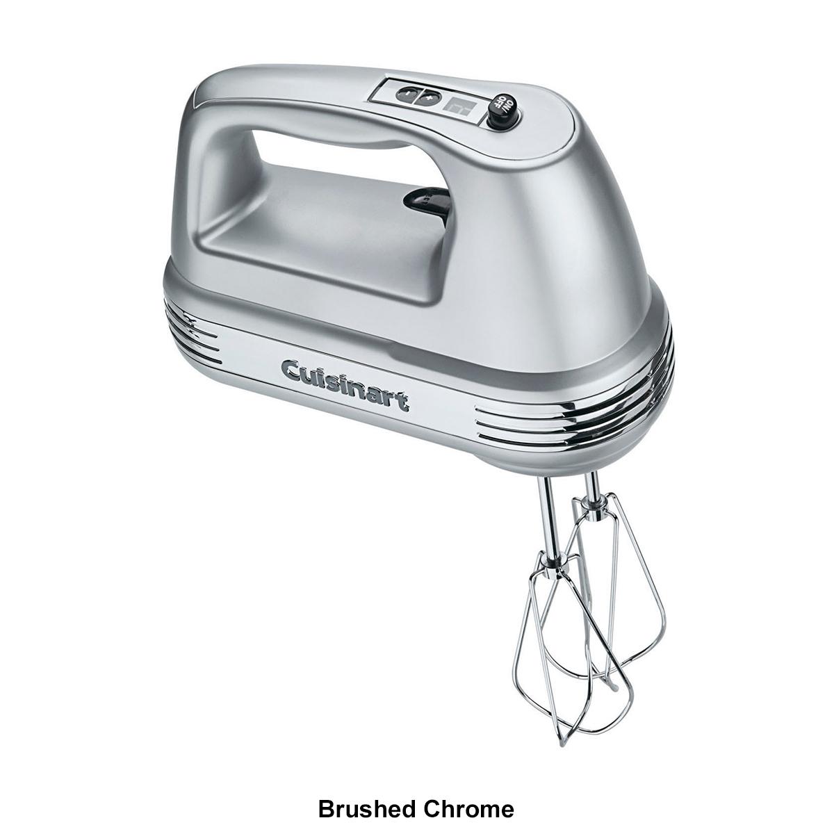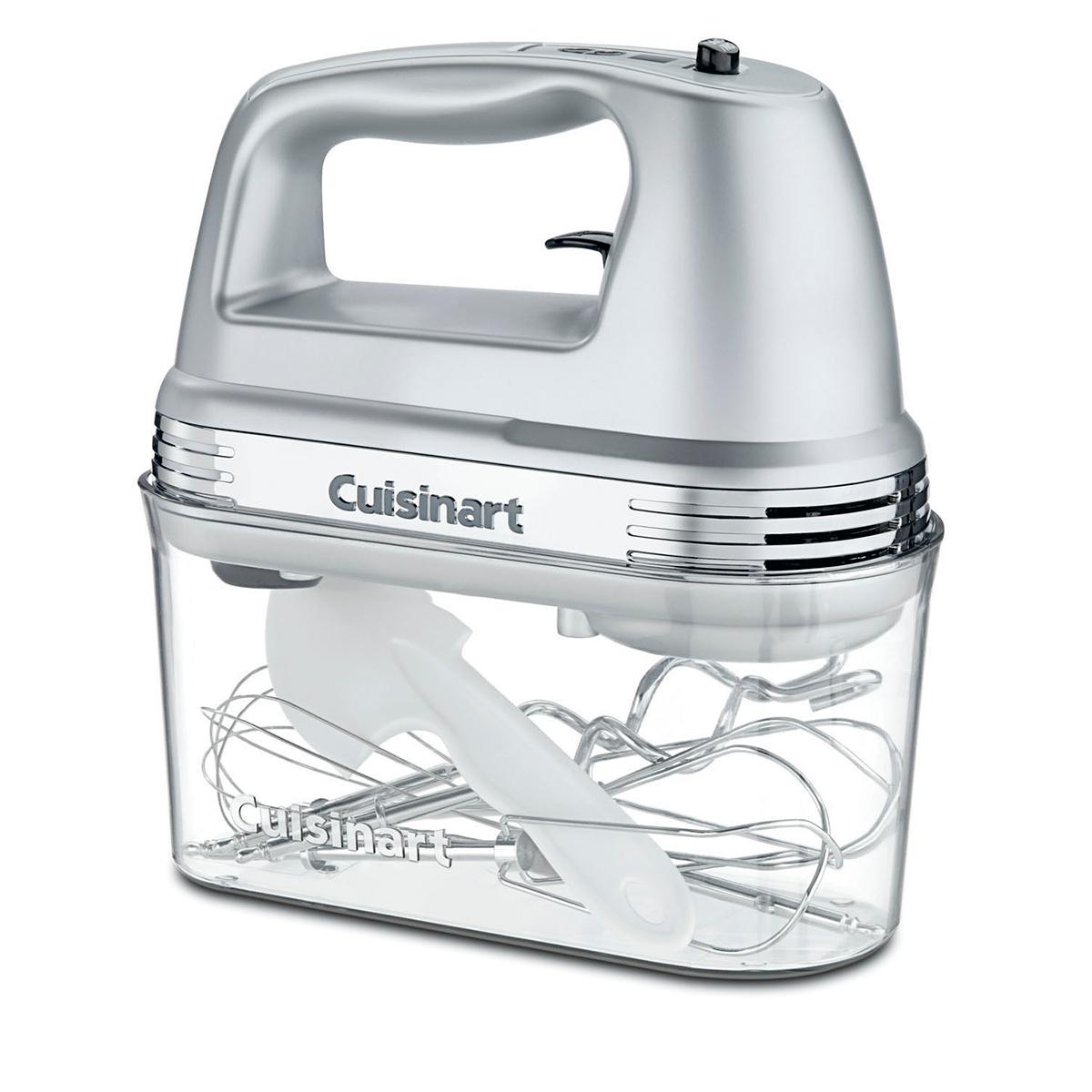 The Cuisinart® Power Advantage Plus 9 speed hand mixer performs any task a recipe calls for and then tucks into its own storage case. With extra-long beaters, chef´s whisk, and dough hooks fit into a clear case, and the mixer snaps on top. 220 watts of power with automatic feedback, a smooth start feature with 3 low mixing speeds eliminates splattering, and a one-step power switch with 9 speed LED display.Model: HM-90BCS, HM-90S
