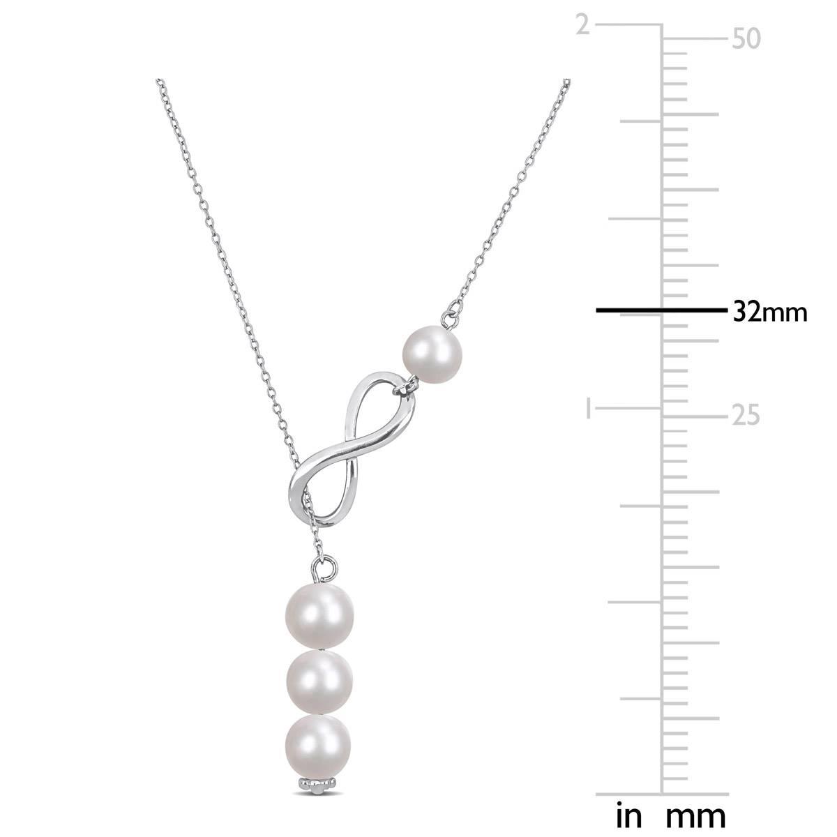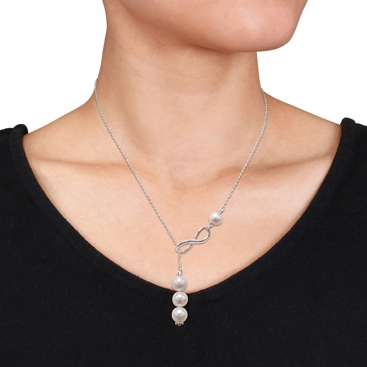 This Gemstone Classics™ sterling silver pearl necklace is crafted in lustrous sterling silver. The necklace features a pendant that has an infinity motif connecting a single off-round freshwater cultured pearl and a string of three off-round freshwater cultured pearls that create a lariat drop. A superb addition to your jewelry collection.