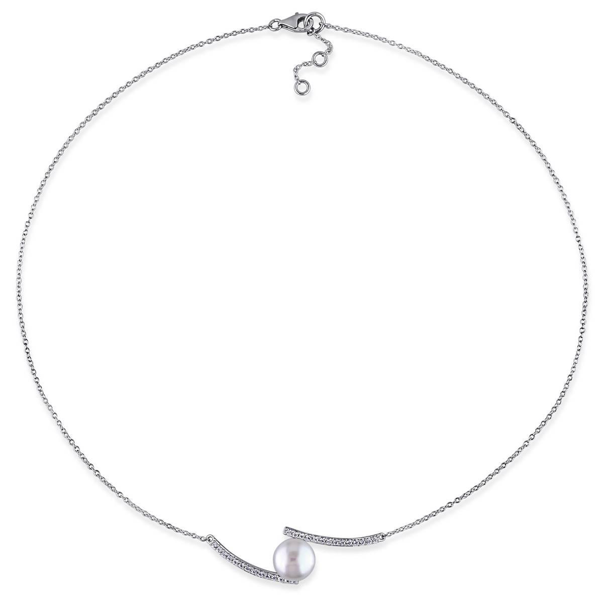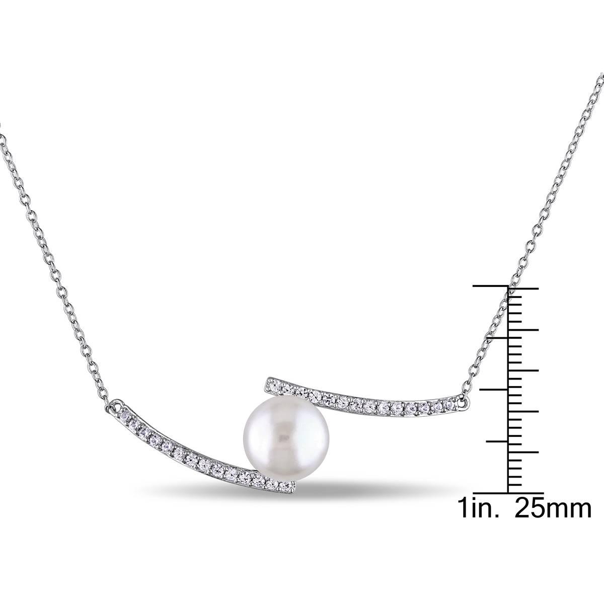 Add some shine to your jewelry collection with this Gemstone Classics™ pearl and sapphire bypass necklace. Crafted in lustrous sterling silver, the necklace features a white freshwater button pearl and round-cut created white sapphire gemstones. This beautiful jewelry is hung on an 18-inch cable chain and is secured with a lobster clasp.