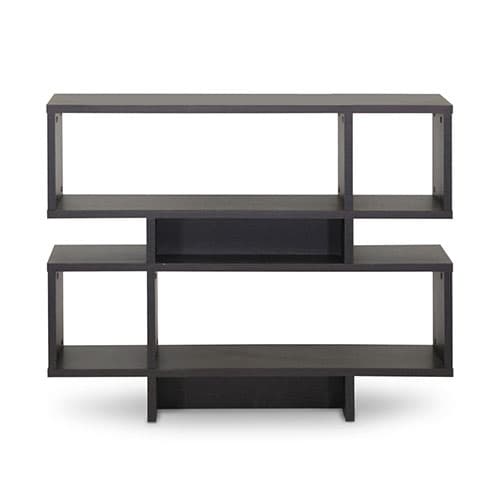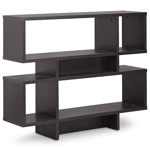 This Baxton Studio Cassidy modern bookshelf is a sculptural, eye-catching piece. It features an engineered wood frame built with four levels, three of which can be used for display of your décor collection. Wipe with a dry cloth to clean. Dimensions: 35.3”H x 44”W x 11.4”D.