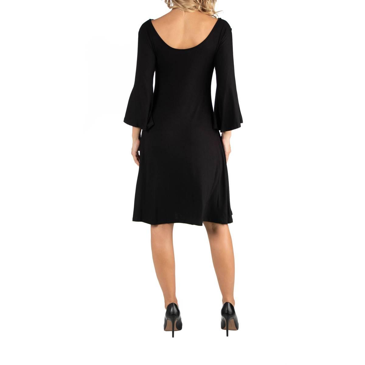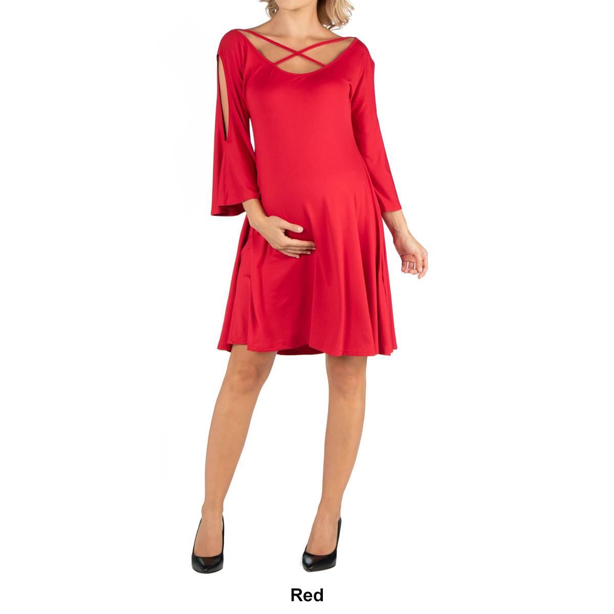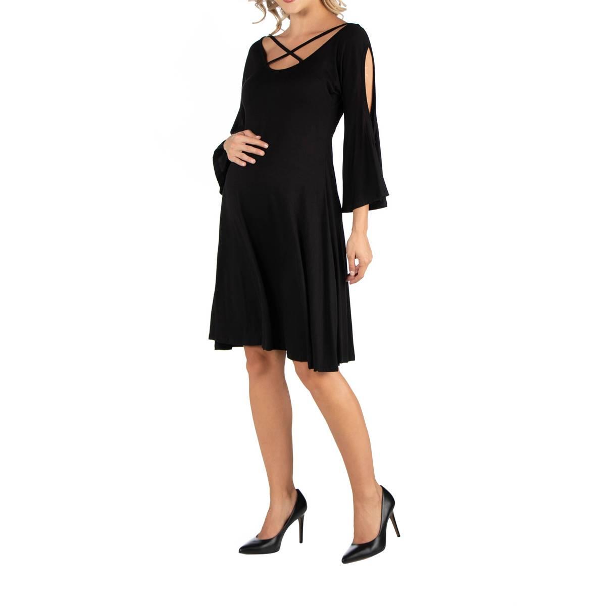 Fashion-forward and comfortable, this Womens 24/7 Comfort Apparel maternity a-line relax shape dress has edgy cold shoulder details with a loose fit. This features 3/4 length flared sleeves, criss-cross strappy neckline, and it is made from a soft comfortable stretch material. Perfect for casual or cocktail settings depending on how it´s styled.