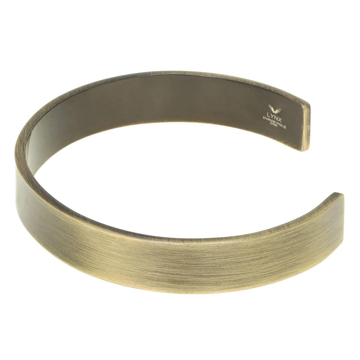 For the stylish, modern man who appreciates his handsome and unique fashion sense, this Mens Lynx antique cuff bangle bracelet is the perfect fit. This men´s cuff bracelet is crafted in stainless steel with gold ion-plating and an antique finish.