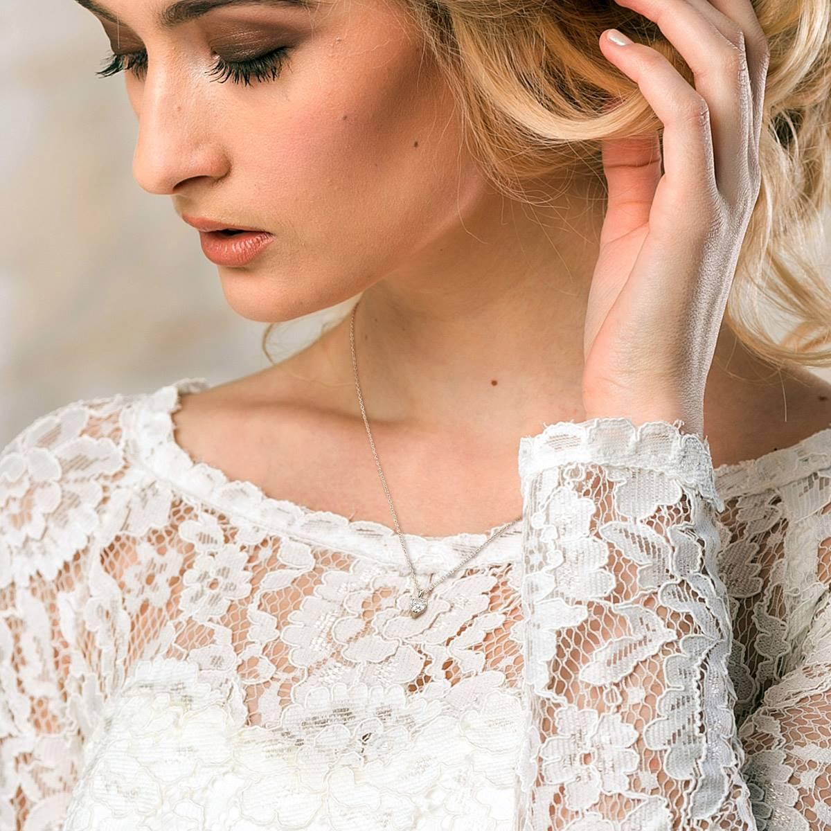 Description This charming solitaire heart necklace is crafted in sterling silver and features a single heart-cut, prong-set shimmering created white moissanite gemstone. The...