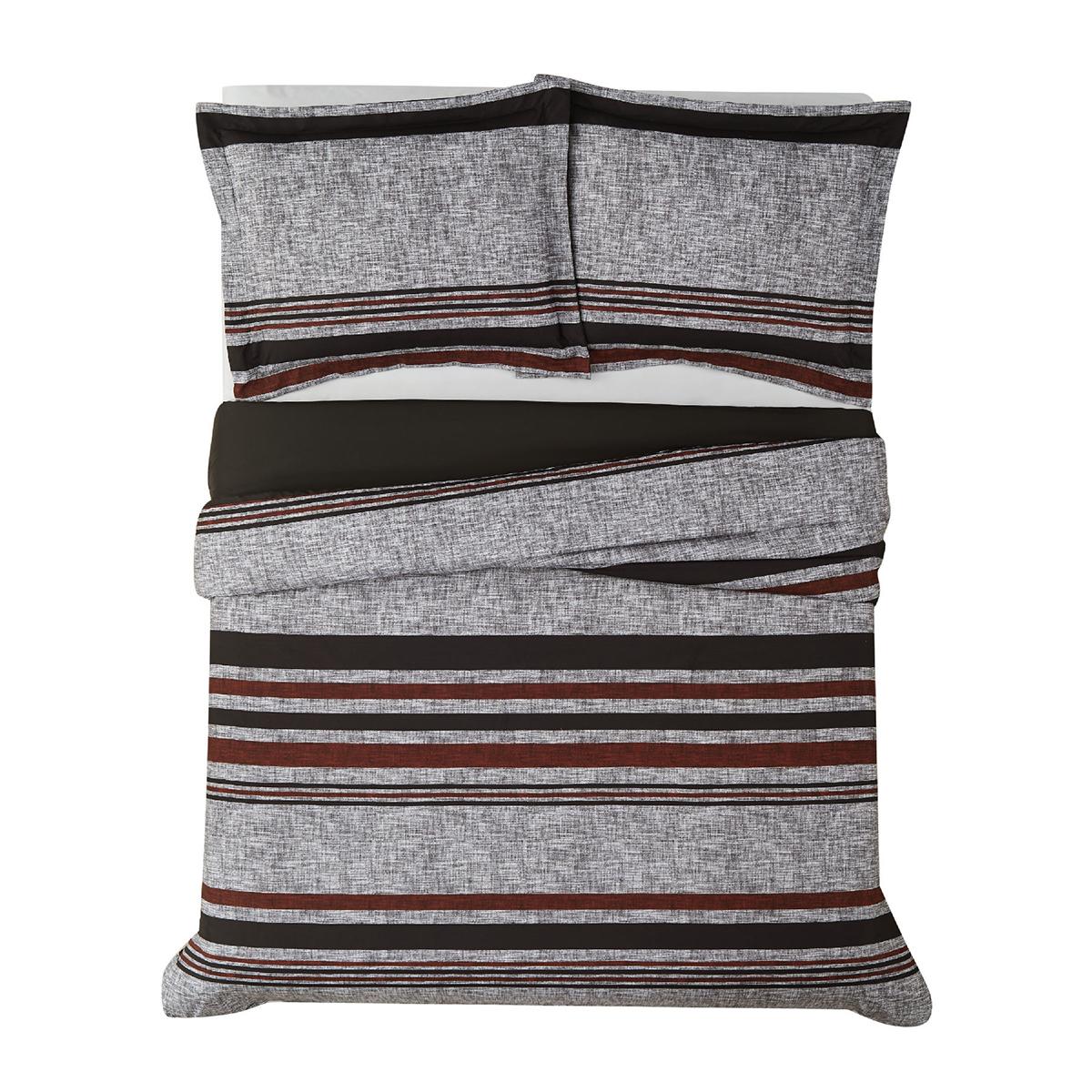 This London Fog Warren 3-piece comforter set features a linen-textured stripe in deep charcoal shades combined with black and deep red making a dramatic statement in any bedroom. This set includes pillow shams and is super comfy with the polyester fill.