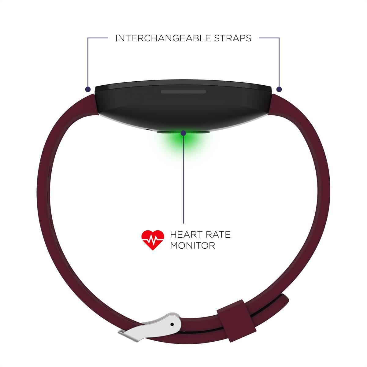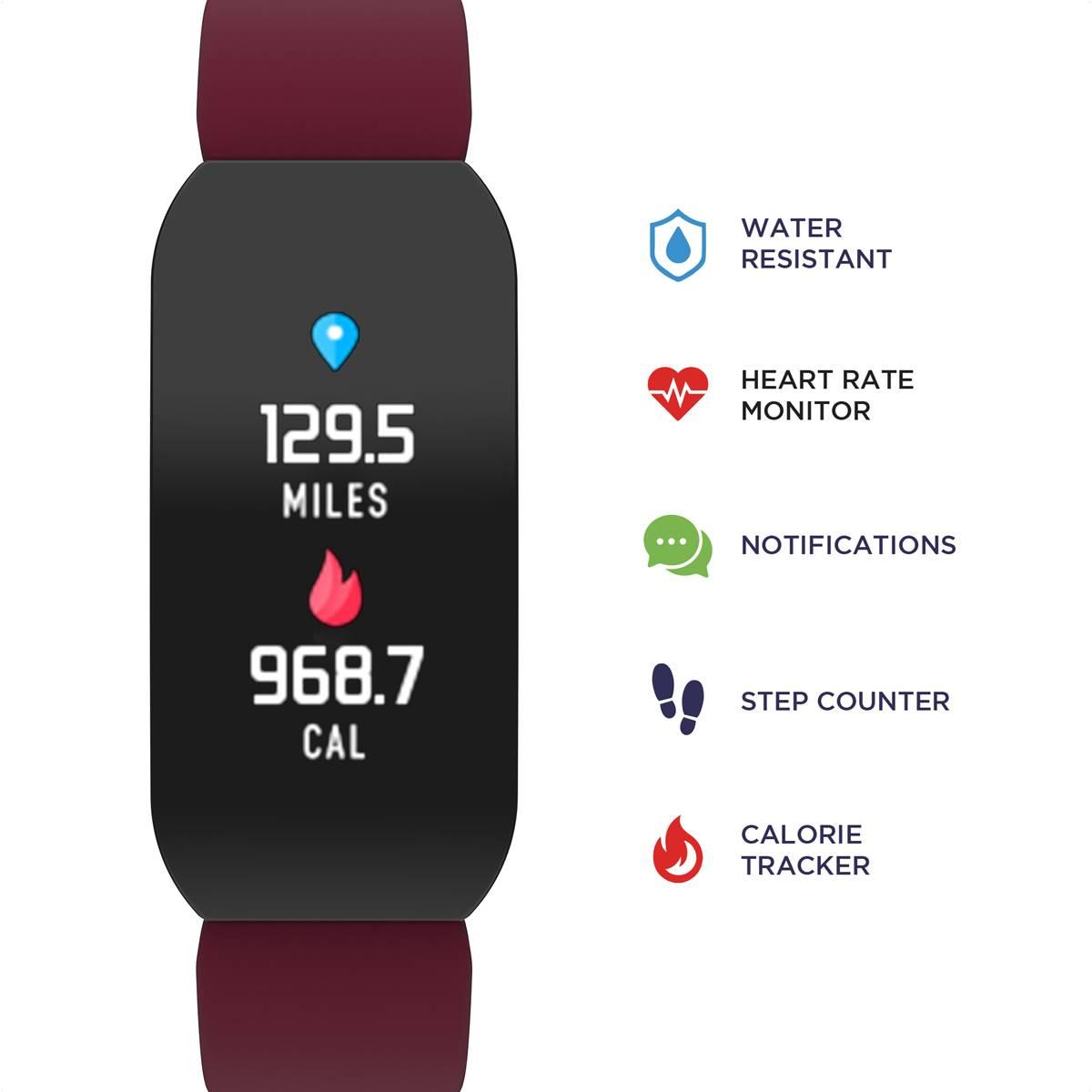 Unisex iTouch Active Smartwatch Fitness Tracker, Heart Rate, Step Counter, Sleep Monitor, Notifications, Waterproof for Men and Ladies, Compatible with iPhone and Android. 23.4mm x 44mm black plastic rectangular case with digital dial. 12.7mm case and 18mm wide burgundy strap including a buckle strap.