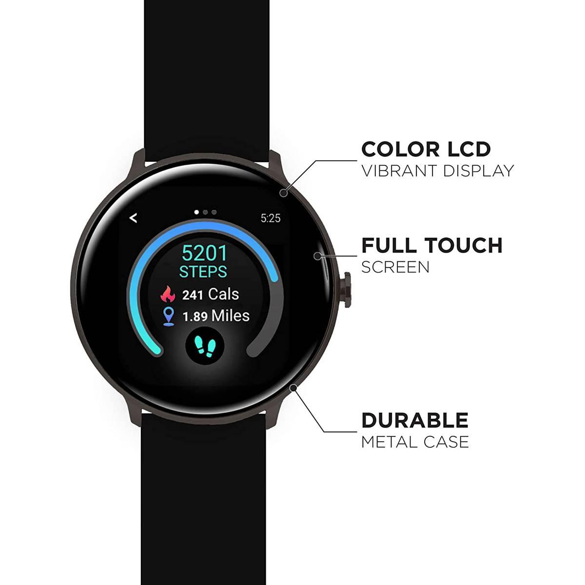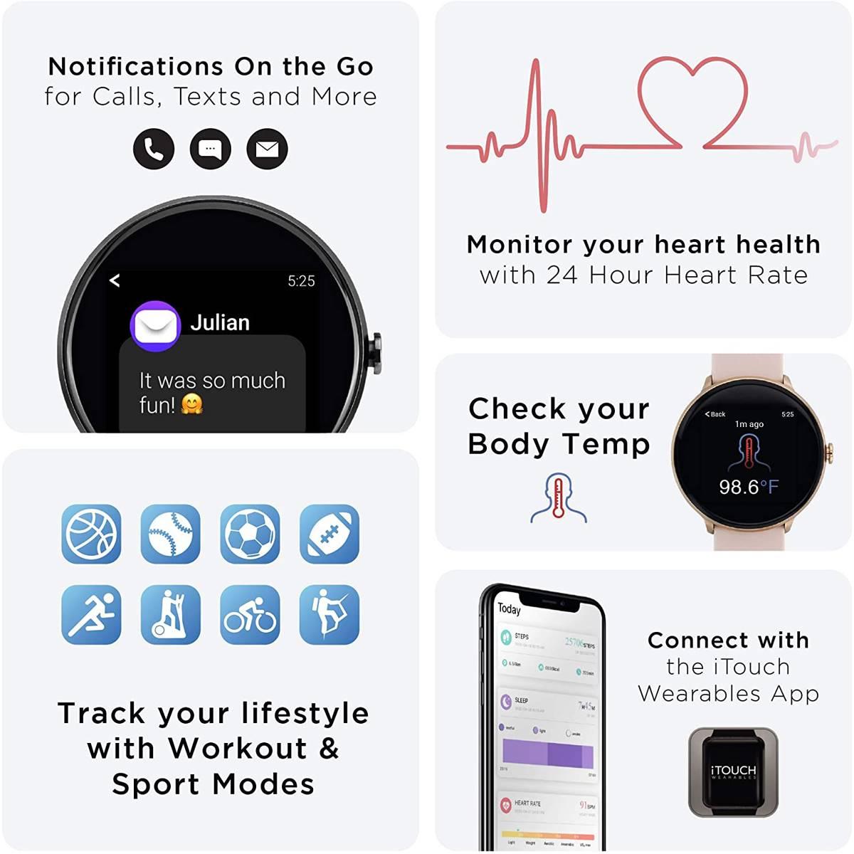 The iTouch Sport 3 is designed to always have your health in mind as it continuously monitors your heart rate 24 hours a day and alerts you if it´s elevated. It also monitors your body temperature, suggests breathing exercises, and reminds you to hydrate throughout the day.Its full touch screen input coupled with its vibrant animated color scheme makes using this smartwatch a breeze. Not to mention, its round case provides a sleek, yet unique style that is reminiscent of a traditional watch. And, thanks to the extended battery life and power-saving mode, a low battery will never slow you down! Smartwatch movement and waterproof.
