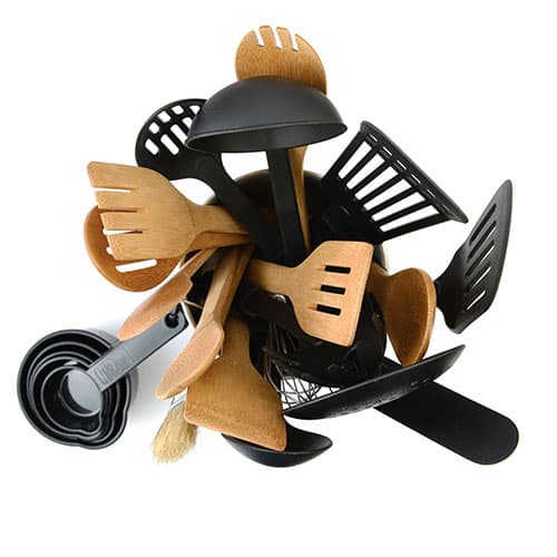 Description The BergHOFF Studio 23 piece Tub of Tools is made of Bamboo, Nylon, and Stainless Steel. Hand wash. Set includes: 11.75" Bamboo Tongs, 11.75" Bamboo Salad Fork,...
