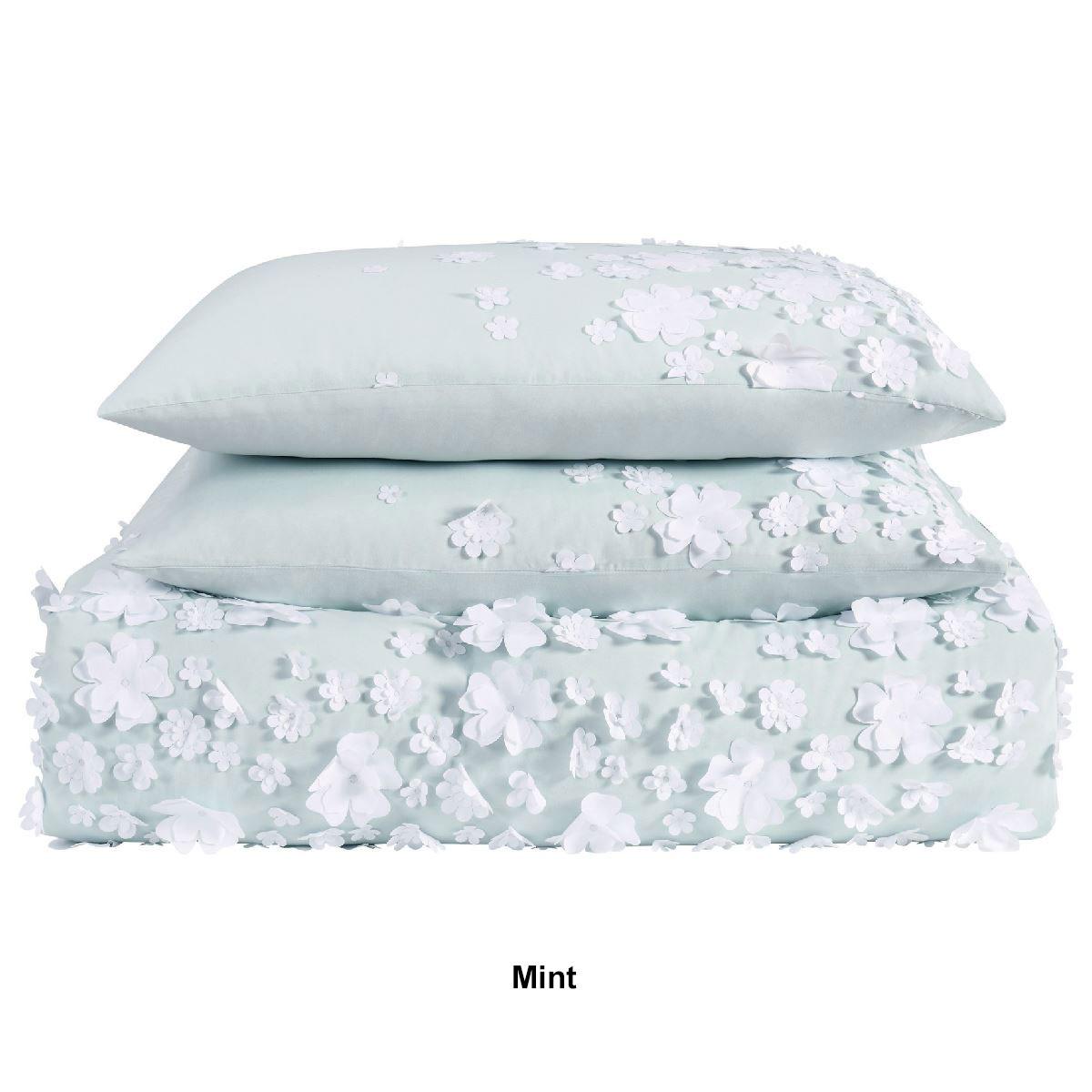 This Christian Siriano New York® confetti flowers comforter set is a masterful combination of a simple solid color design with the delicate touch of three dimensional floral appliqued flowers in various sizes on the face fabric.