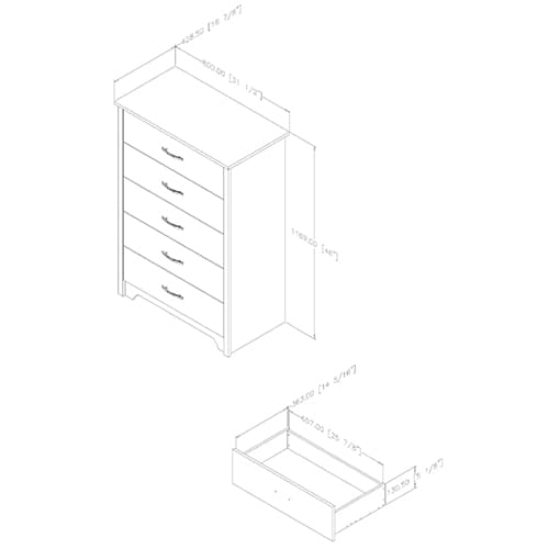 With its transitional kick plate and its molding on both sides of the drawers, this dresser South Shore Pure Black 5-Drawer Chest from the Fusion collection will help you create a trendy and peaceful bedroom. Its minimalist lines and neutral finish allow it to fit in anywhere. Its many storage spaces are ideal for keeping your room well organized. The dresser features elegant, delicately grooved handles and a kick plate with cutout, for a transitional style. There is also molding on both sides of the drawers, for a refined finishing touch. Dimensions: 46”H x 31.5”W x 17”D.