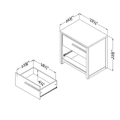 This South Shore 2-drawer Nightstand, with its urban look and grey oak finish, lets you create an elegant, distinctive ambiance in your bedroom. The drawers provide maximum storage space, and the unique looking clean lined handles give this piece a lot of personality. The dresser features a grey oak finish wood handles and has metal drawer slides for smooth gliding. Dimensions: 23.5”H x 23.5”W x 16.5”D.