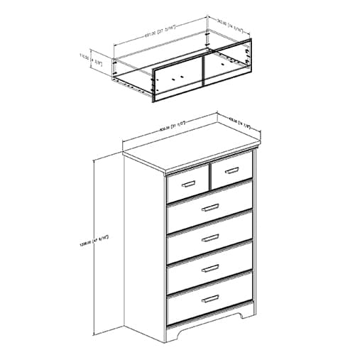 You will love this South Shore Versa 5-Drawer Chest for its many storage spaces. The top drawers are separated by a decorative groove that creates the illusion of double drawers. The dresser features modern metal handles in a matte black finish. Decorative groove on the top drawer that creates the illusion of double drawers. For your children’s safety and your own: plastic drawer slides with safety stop and dampers. Made of laminated particle board. Dimensions: 48”H x 32”W x 17”D.