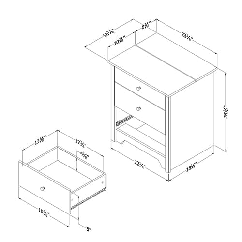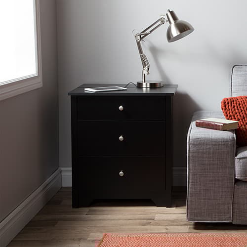 The South Shore Pure Black Vito Nightstand with Charging Station and Drawers features modern convenience and transitional craftsmanship. It’s more than a night stand, since you can slide the tray out and convert it into a charging station. You get lots of closed storage space, as well as the functionalities needed for electronics management. The nightstand features metal knobs in a matte nickel finish and angled wooden legs, for a transitional style. It also has 2 elegant framed glass doors, letting the signal through for optimum use of your electronic devices. Dimensions: 26.5”H x 23.5”W x 19”D.