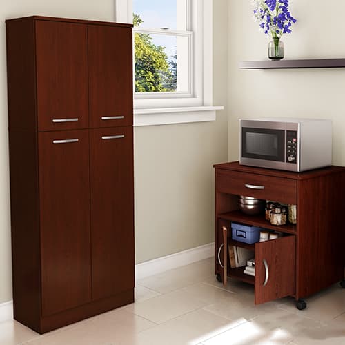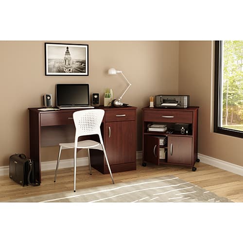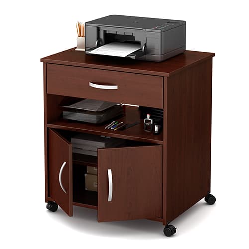 This South Shore Axess cherry printer cart on wheels is the ideal solution for adding some versatile storage space. Casters mean you can move it around easily – so it’ll be of help in organizing your office efficiently. Features both open and closed storage spaces, for a neat, orderly room. The metal handles are finished with satin nickel for a contemporary style. The cart features built-in brakes on two of the casters. Behind the doors there are 2 storage spaces separated by 1 adjustable shelf that can hold up to 15 lbs.