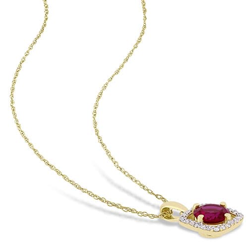 Description This Gemstone Classics™ 10kt. yellow gold and ruby pendant with chain will add a touch of elegance and color to any look. This modern floating square halo drop...
