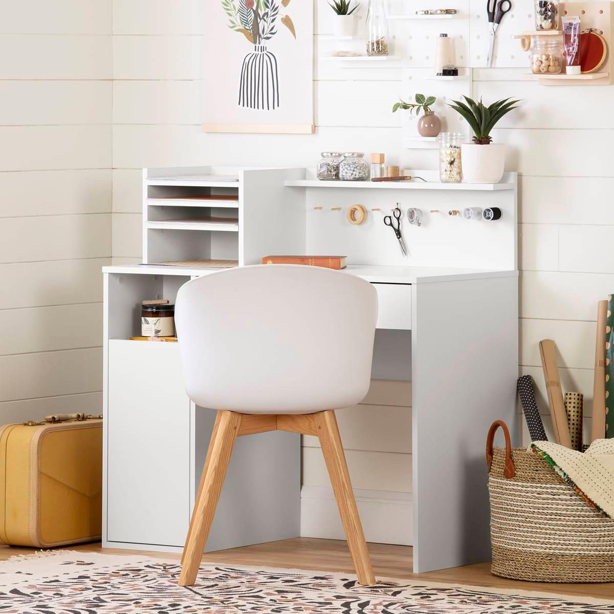 Description This South Shore Crea craft table has 10 wooden rods that you can use to hang all your essentials: ribbons, scissors, thread, bobbins, etc. The upper shelf of the...