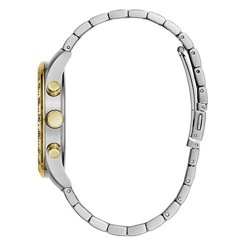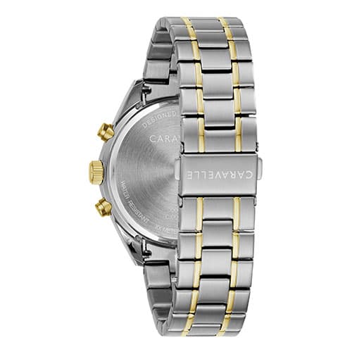 This Mens Caravelle watch is built for style and function. Its design showcases a six-hand chronograph with a date feature on a bold blue dial. Other features a sleek two-tone stainless steel case and bracelet with gold accents and a double push fold-over closure. Water resistant to 50mm. Case Diameter: 44mm.Style 45B152.Limited Manufacturer´s Warranty.
