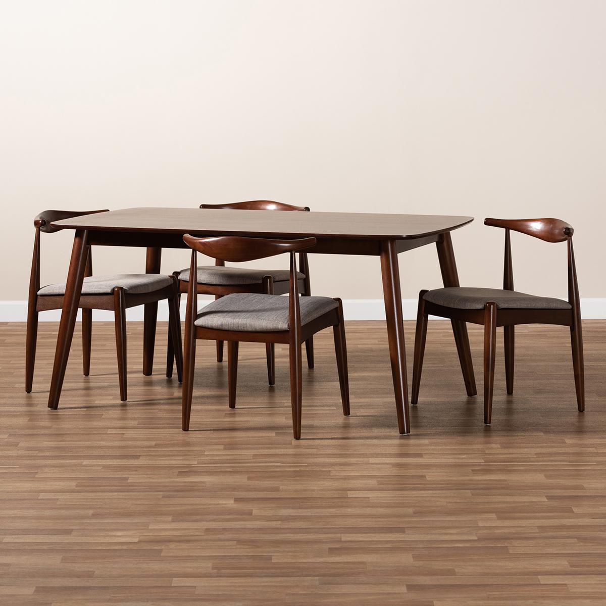 Give your dining space a stylish retro-inspired look with the Baxton Studio Amato 5-piece dining set. Constructed from sturdy rubberwood, this dining set includes one table and four chairs, each upholstered in a light grey polyester fabric that complements the warm walnut brown stained wood. Foam padded seats provide the utmost dining comfort. Inspired by mid-century modern design, the pieces feature a low silhouette and angled, tapered legs.