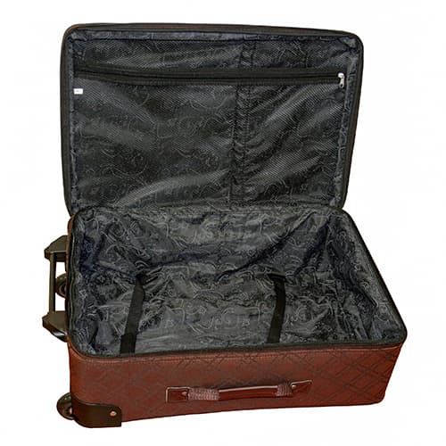 The American Flyer Pemberly Buckles 5-piece Luggage Set showcases a beautiful print style design. It features a fully lined interior with a zippered mesh pocket and shoe pockets for maximum organization. The uprights offer an additional 2.5-inches of additional packing space, and feature a telescoping handle with top and side handles for simple mobility with inline skate wheels that offer a more smooth and quiet ride. The wheeled duffle has a u-zip feature for quick packing. The cosmetic satchel offers a detachable shoulder strap with exterior pockets for added storage. Wipe Clean. Set includes: