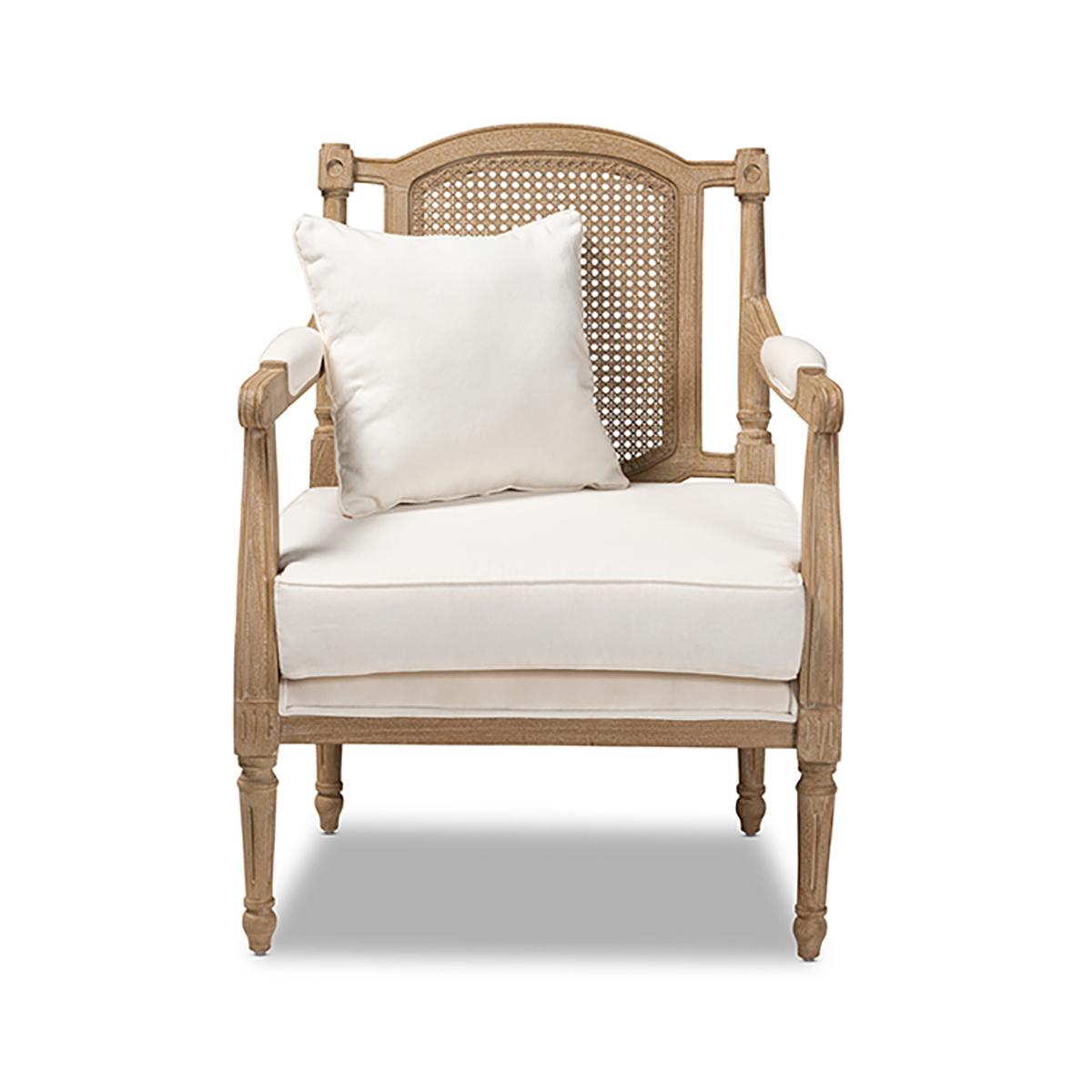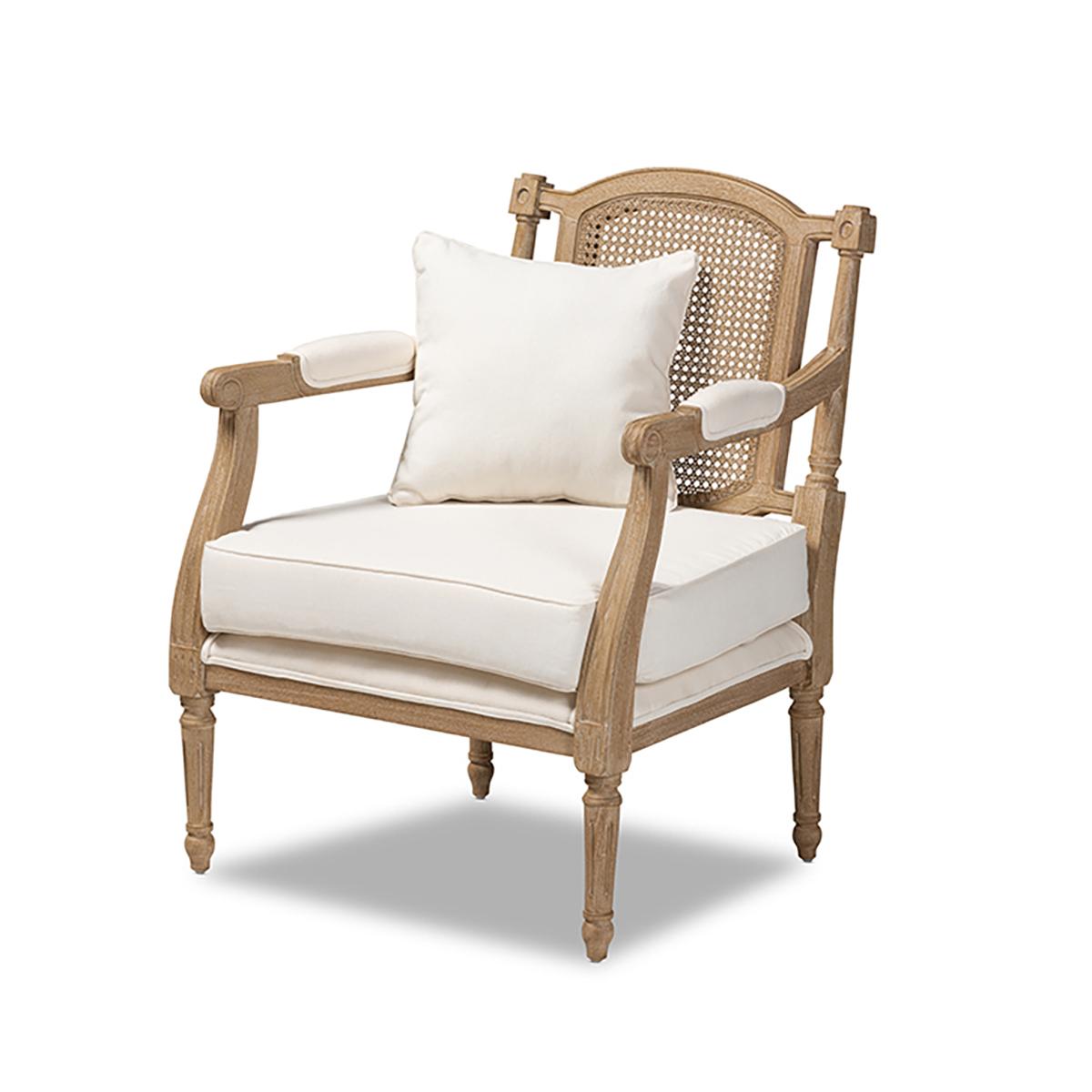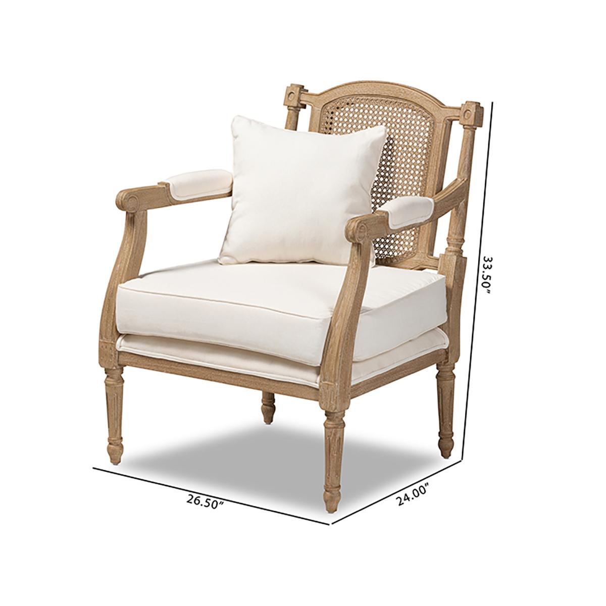 Adds elegance to any room. Constructed from solid mahogany wood, the Baxton Studio Clemence armchair displays a natural white-washed finish for an antique look. Stunning craftsmanship shows on the intricately carved frame, as well as the woven rattan back. Designed to add both comfort and beauty to your space, the Baxton Studio Clemence is upholstered in elegant ivory fabric and features thick foam padding on the seat and armrests. Included is a matching accent pillow that completes the look.
