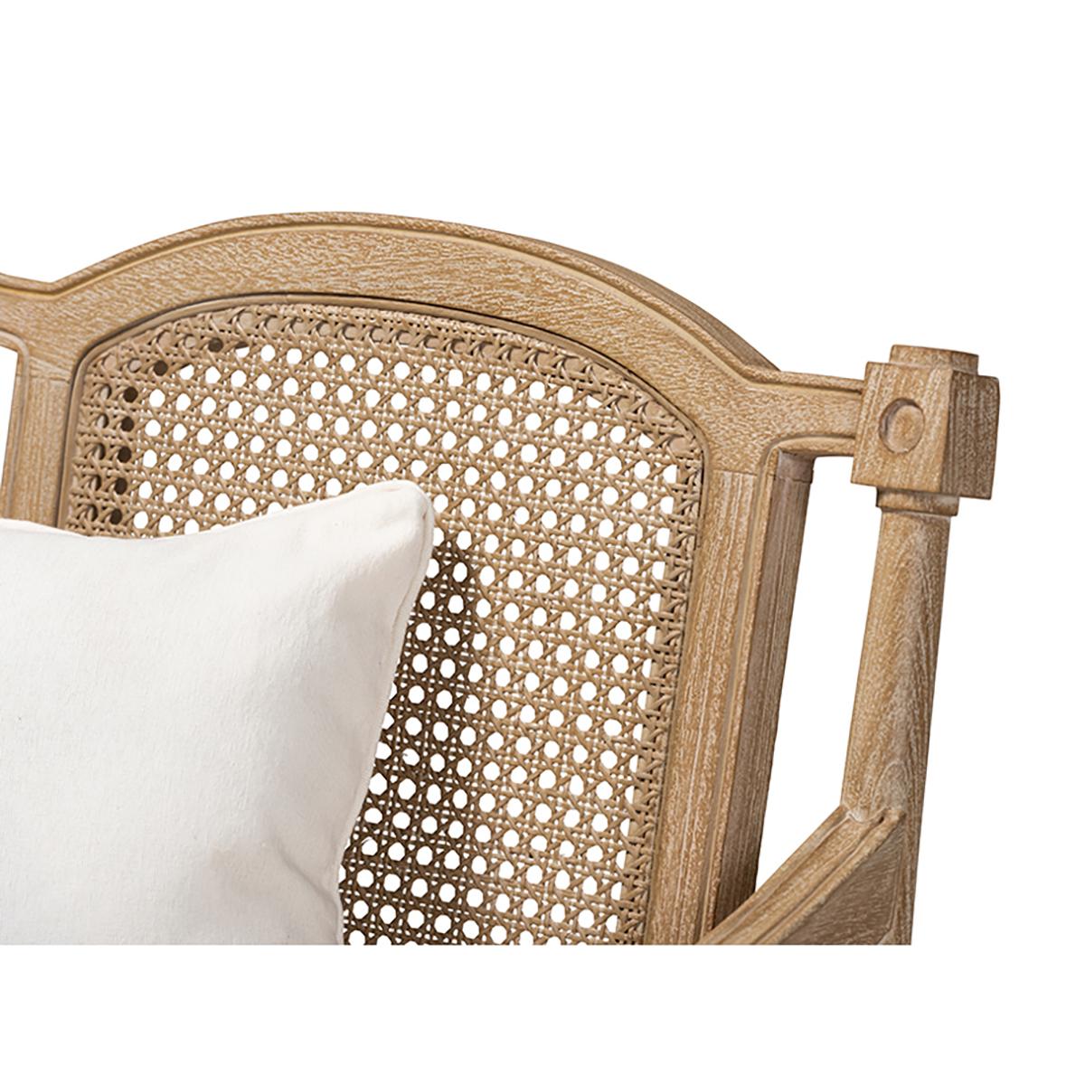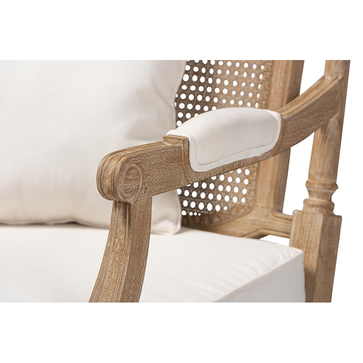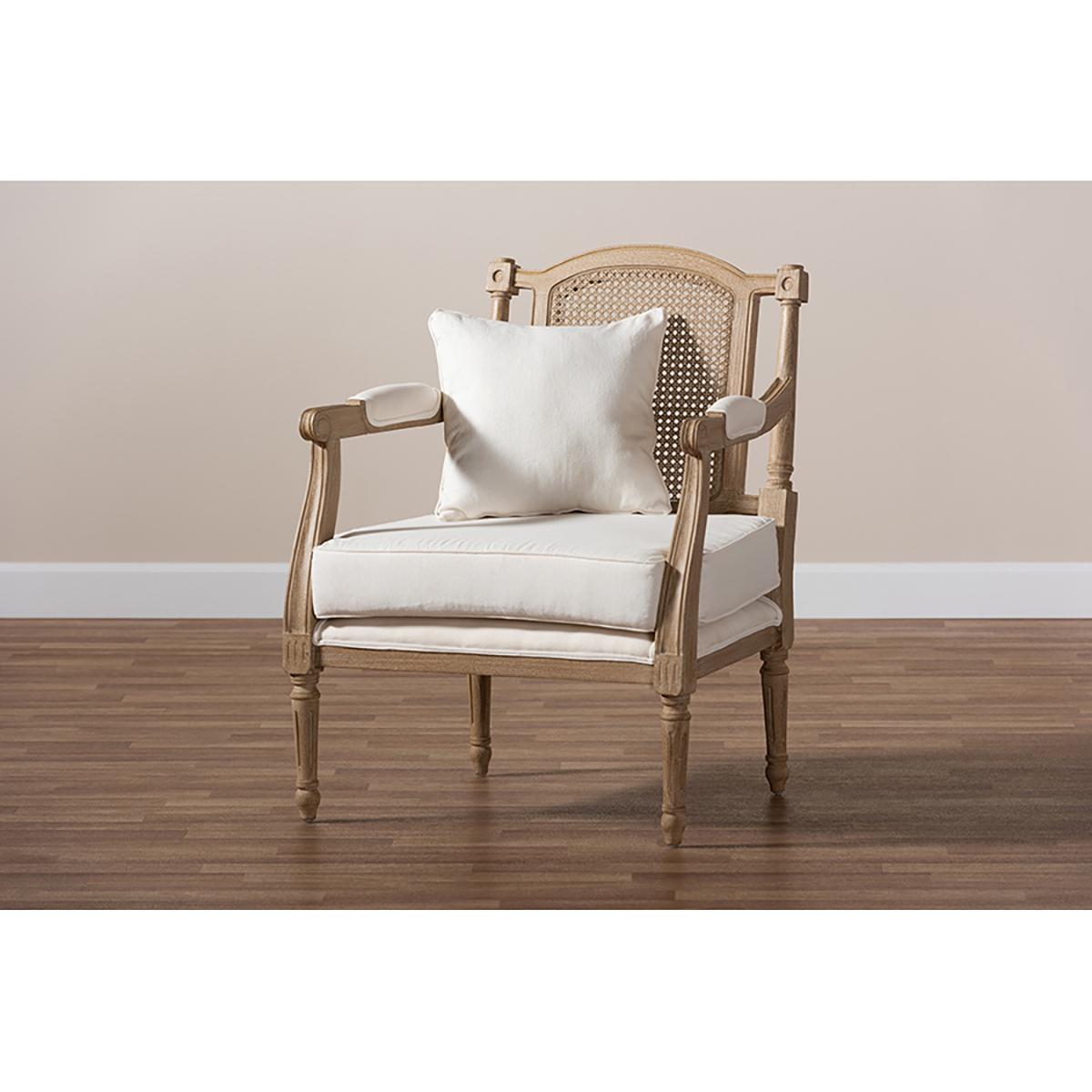 Adds elegance to any room. Constructed from solid mahogany wood, the Baxton Studio Clemence armchair displays a natural white-washed finish for an antique look. Stunning craftsmanship shows on the intricately carved frame, as well as the woven rattan back. Designed to add both comfort and beauty to your space, the Baxton Studio Clemence is upholstered in elegant ivory fabric and features thick foam padding on the seat and armrests. Included is a matching accent pillow that completes the look.