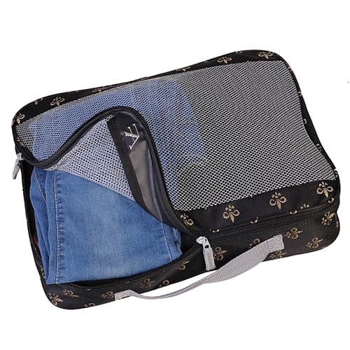 The American Flyer Aztec 3-piece Packing System showcases a lightweight construction with maximum organization. They feature a soft mesh top for easy looking and ventilation, sturdy corner piping, and a convenient strap handle so you can carry it by itself. Set includes 3 packing sizes.