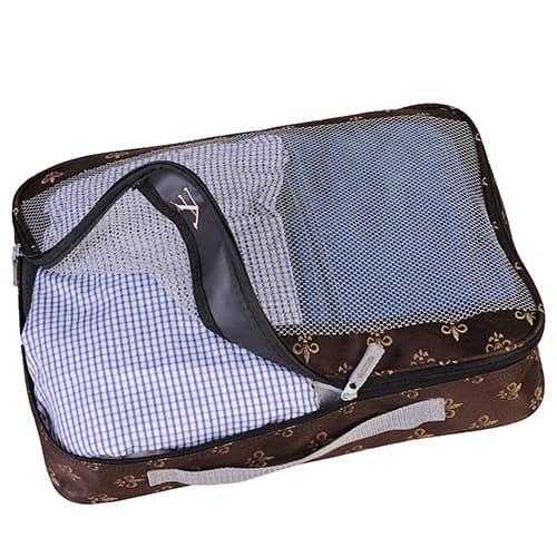 The American Flyer Aztec 3-piece Packing System showcases a lightweight construction with maximum organization. They feature a soft mesh top for easy looking and ventilation, sturdy corner piping, and a convenient strap handle so you can carry it by itself. Set includes 3 packing sizes.