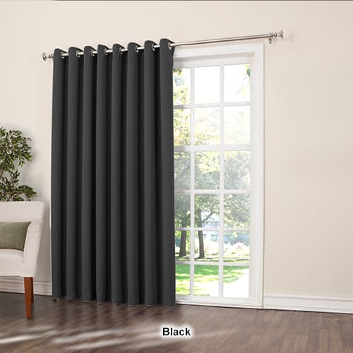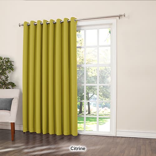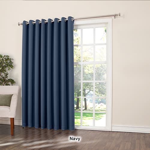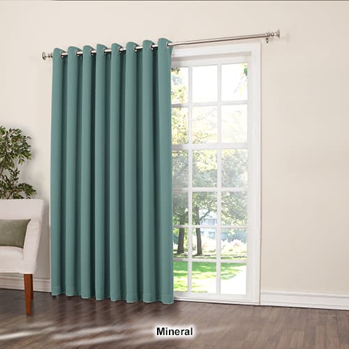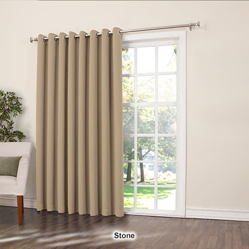 The Sun Zero Michael Extra Wide Room Darkening Patio Curtain Panel is perfect for large windows and patio doors. The woven solid design has an easy-to-hang grommet top that offers a classic style that fits in with any room decor while reducing light and noise for better sleep. Help keep your home cooler in the summer and warmer in the winter. Some light will show through. These curtain panels do not allow a view through and provide complete privacy. The darker the color the better the light reducing capabilities. Easily open and close with the attached wand. 1 Panel per package. Hang on a rod up to 1.5 inches in diameter. Made of 100% Polyester. Machine wash. Tumble dry.