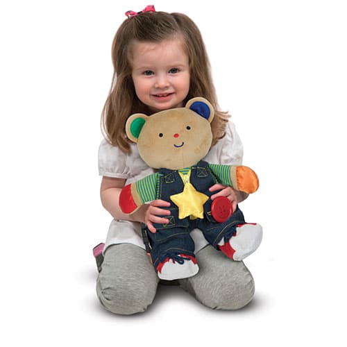With the Melissa & Doug® Teddy Wear toddlers and preschoolers will learn the basics of self care, refining grasp, and hand-eye coordination skills. This adorable plush bear comes dressed in a removable outfit packed with closures. Buttons, zippers, self-stick tabs, buckles, and laces will keep fingers working on a number of different levels, offering a mix of encouragement and challenge. A mix of textures adds a level of sensory input making this a terrific toy for kids of all abilities! Do not leave in crib unattended.