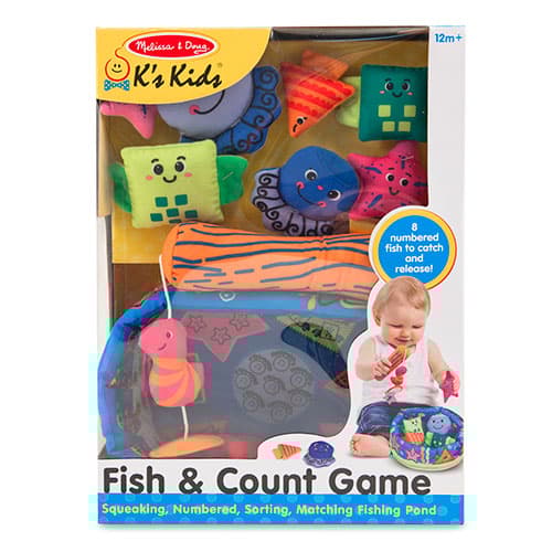 The Melissa & Doug® Fish & Count Game is designed to nurture early childhood development in your child´s physical, cognitive, and social areas. With interactive designs and multisensory features, these games promote constructive play and effortless learning. For this game, you will fill the pond with "fish" hold the squeezable rod, and reel in the fun! The game is simple. Just lower the self-stick bait into the fishing pond, let it attach to one of the felted pieces, and lift out your catch! The fabrics are colorful, while the pieces offer the opportunity to count, sort, match, identify colors, compare sizes, and story tell. This play set is adaptable for any age, and also helps with hand-eye coordination and finger strength.