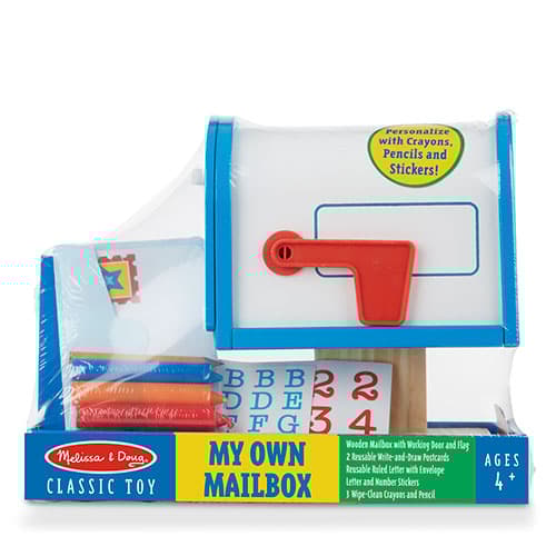 With the Melissa & Doug® My Own Mailbox kids can send and receive “mail”. This sturdy wooden box comes with letter and number stickers so kids can decorate it with their name, address, or any special message. This mailbox has hinged doors that open to make room for two postcards. The mailbox comes with a letter and envelope, and reusable crayons. Also included with this toy are play ideas to keep the box filled with correspondence.