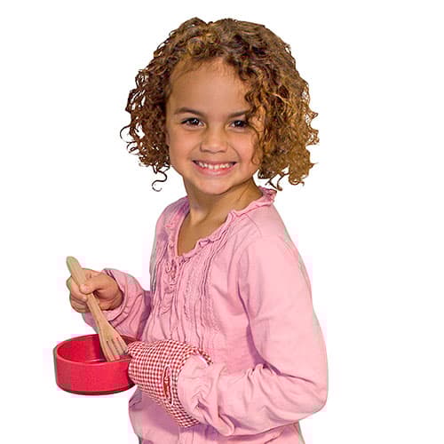 The Melissa & Doug® Kitchen Accessory Set is an 8 piece wooden cook set that includes a frying pan, stockpot and saucepan with lids, spoon, slotted spatula and an oven mitt! This set has everything your little chef will need!Dimensions: 12”H x 12”W x 5”D.