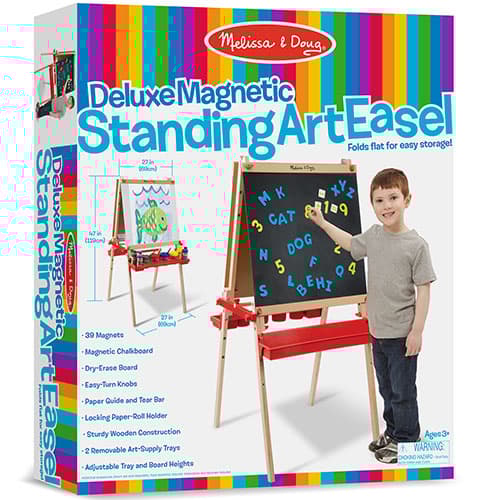 Description Help to spark creative expression in your budding artists with the Melissa & Doug® Deluxe Easel/Magnetic Boards. This board features both a magnetic chalkboard as...