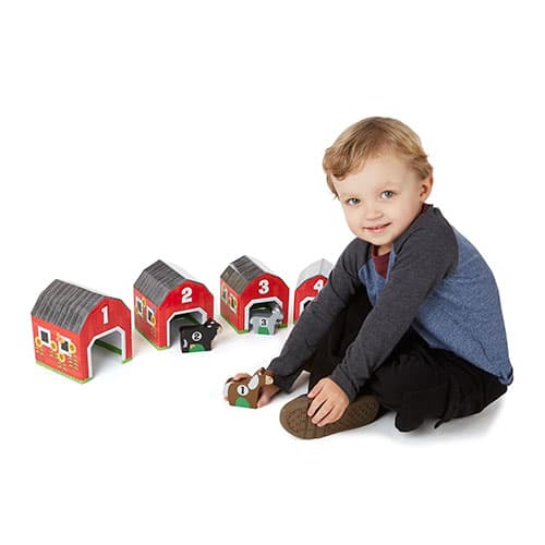 The Melissa & Doug® Nesting & Sorting Barns & Animals lets kids build a farm scene filled with bright red barns with an animal for every barn. On their front panels, the barns feature doors that are sized to fit their animal occupants. On the back a full-color scene shows the animal in an outdoor setting. Kids can pair numbers on the barns and animals to put together the correct pairs, reinforcing early learning.