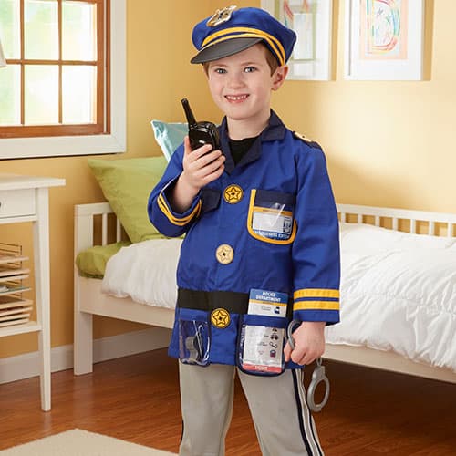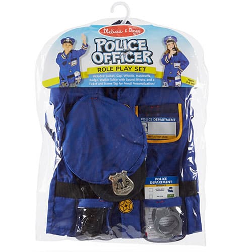 Your little officer will love enforcing the law in the Melissa & Doug® Police Officer Role Play Set! The set includes a machine washable jacket and cap, shiny badge, whistle, walkie-talkie, handcuffs, ticket and name tag!Dimensions: 23.3”H x 16.7”W x 1.6”D.