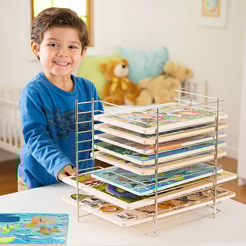The Melissa & Doug® Deluxe Wire Puzzle Rack is the solution for storing your puzzles. This sturdy wire rack holds up to 6 large and 6 small puzzles.