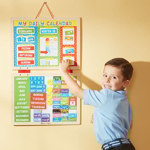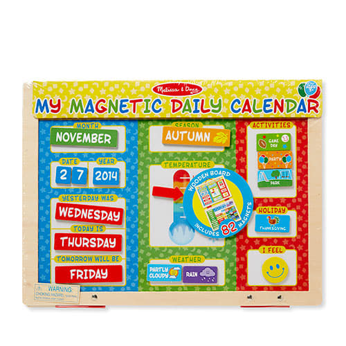Kids will feel a greater sense of responsibility with the Melissa & Doug® My First Daily Magnetic Calendar! With this calendar they can help post the way of the week, date, weather and special events on the large magnetic board. There is even a space for them to post their mood. To change the information simply take a preprinted magnet from the lower board and place it on the calendar. Or you can make a custom magnet by writing on one of two dry erase tiles. There are fields for day, date, season, weather, temperatures, activities, and holidays.Dimensions: 15.7”H x 11.8”W x 1”D.