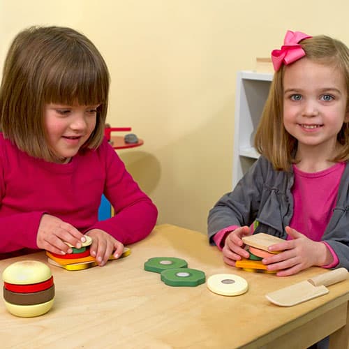 Kids can stack their sandwich anyway the like using the Melissa & Doug® Sandwich Making Set. Use the wooden knife to slice apart the 16 pieces while hearing the realistic crunch sound and stack away. The set comes with a wooden storage tray to hold everything together when you’re done playing.