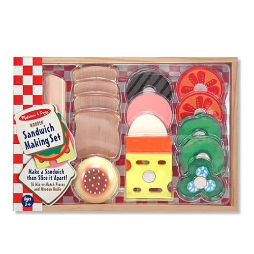 Description Kids can stack their sandwich anyway the like using the Melissa & Doug® Sandwich Making Set. Use the wooden knife to slice apart the 16 pieces while hearing the...