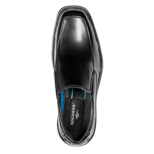 Description Mens Dockers® Lawton Black loafers feature a leather upper with a slip on style, elastic goring on the sides, a square toe, comfort cushioned footbed and man made...