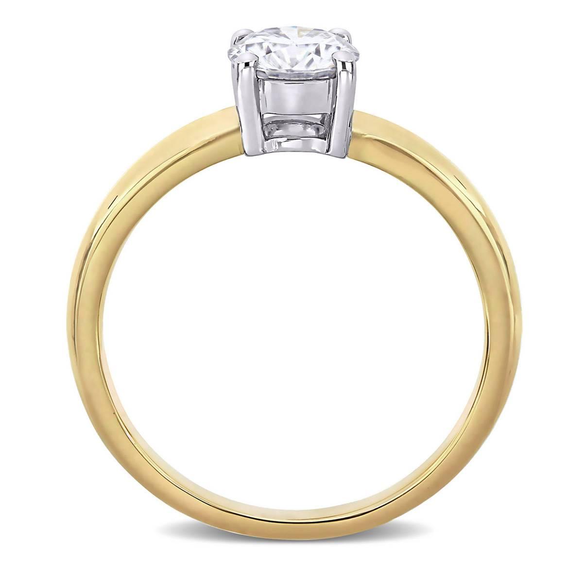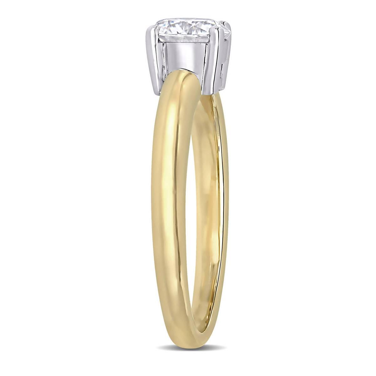 Description This unique Diamond Classics™ moissanite solitaire engagement ring is crafted in 14kt. yellow gold with 4 white gold prongs and features a round-cut, prong-set...