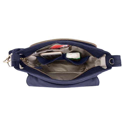 With the Travelon anti-theft courier tour tote bag you can go anywhere safely and securely! Travel with confidence and peace of mind with anti-theft features like hidden slash resistant stainless steel mesh body panels, locking zippers, and a stainless steel cable strap that is adjustable. Made with Polyester and Cotton.