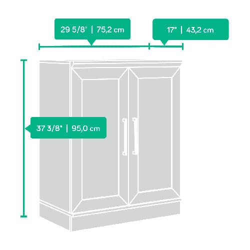 This Sauder HomePlus base cabinet is stackable up to two high, and features an adjustable shelf behind framed panel doors. The enclosed back panel has cord access. Sienna Oak finish. Dimensions: 37.25"H x 28.5"W x 17"D.